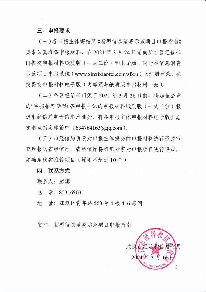 各申報企業(yè)需按照《新型信息消費示范項目申報指南》要求認真準備申報材料,在2021年3月23日17:00之前提交申報材料紙質(zhì)版(一式三份)至東湖高新區(qū)政務中心7號樓7016室和word電子版及PDF蓋章版一并打包發(fā)送至郵箱1930171438@qq.com,同時在信息消費示范項目申報系統(tǒng)(www.xinxixiaofei.com/sfxm)上注冊登錄,在線提交申報材料電子版(內(nèi)容須與紙質(zhì)版申報材料一致)。